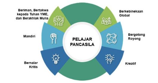 Pelajar Pancasila adalah perwujudan pelajar Indonesia sebagai pelajar sepanjang hayat yang memiliki kompetensi global dan berperilaku sesuai dengan nilai-nilai Pancasila, dengan enam ciri utama: beriman, bertakwa kepada Tuhan YME, dan berakhlak mulia, berkebinekaan global, bergotong royong, mandiri, bernalar kritis, dan kreatif, seperti ditunjukkan oleh gambar berikut: